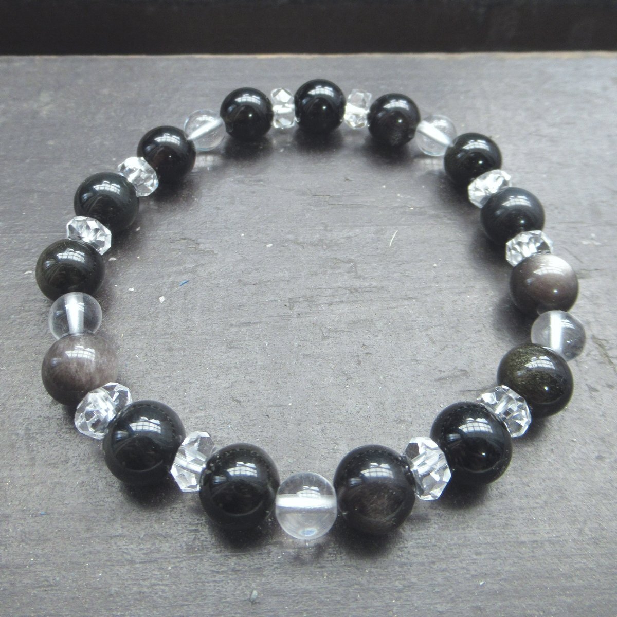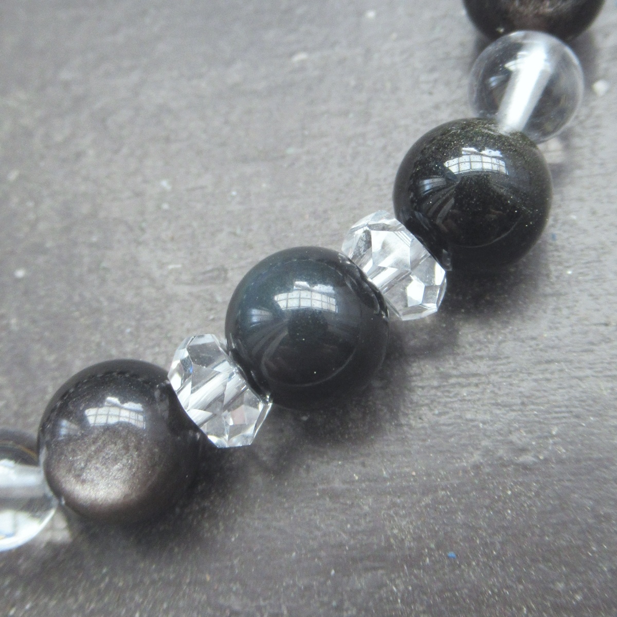レインボーオブシディアンxゴールデンオブシディアンxシルバーオブシディアンxカット水晶ブレスレット